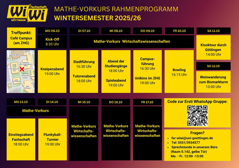 Schon bald beginnt Euer Studium an der Georg-August-Universität Göttingen. Um Euch den Einstieg in das sagenumwobene Uni-Leben zu erleichtern, gibt es von uns, von der WiWi Fakultät und von der WiWi O-Phase ein vielfältiges Programm, damit ihr für den Vorlesungsbeginn am 27.10.2025 schon bestens gerüstet seid.